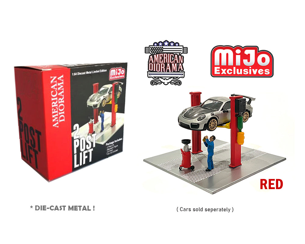 American Diorama 1:64 2 Post Lift With Mechanic Figure & Oil Drainer Red